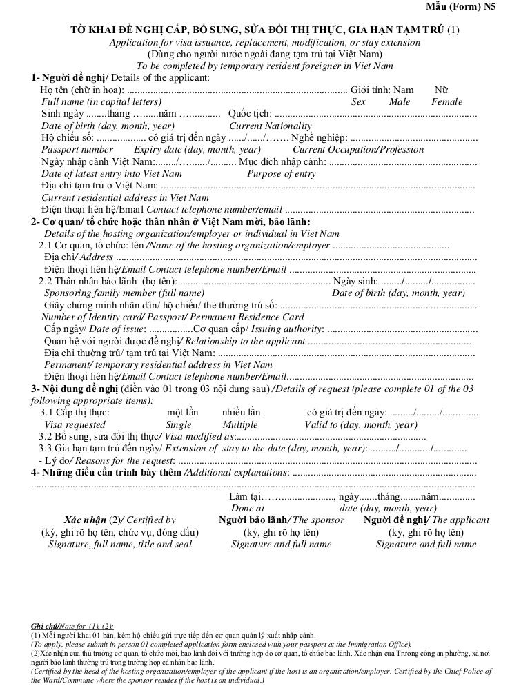 Mẫu gia hạn visa tại việt nam N5